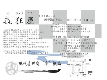 煙管を愛する全ての人に贈る、一夜限りの煙管バー「喜狂家」も今回で三回目を迎えました。 今回はちょっぴりアカデミックに煙管に迫ります。 煙管職人、煙草提供者、煙管初心者から愛好家までが西陣に集い、お酒と料理をお供に煙管を語..