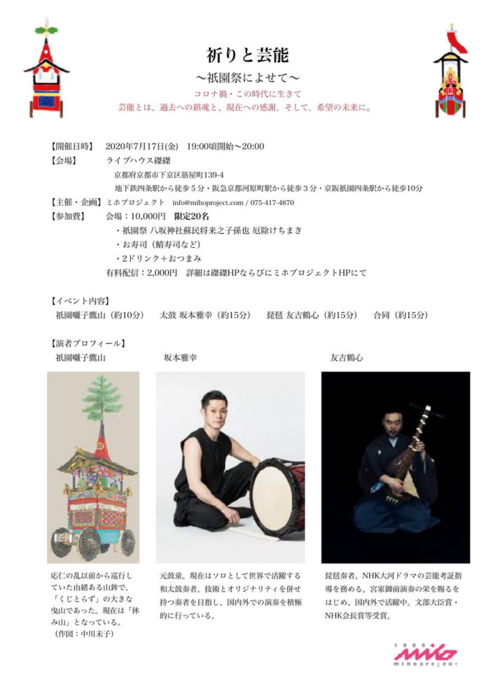 ミホプロジェクトからイベントのご案内です。 祈りと芸能 ~祇園祭によせて~ コロナ禍・この時代に生きて 芸能とは、過去への鎮魂と、現在への感謝。そして、希望の未来に。 【開催日時】 2020年7月17日(金) 19:00..