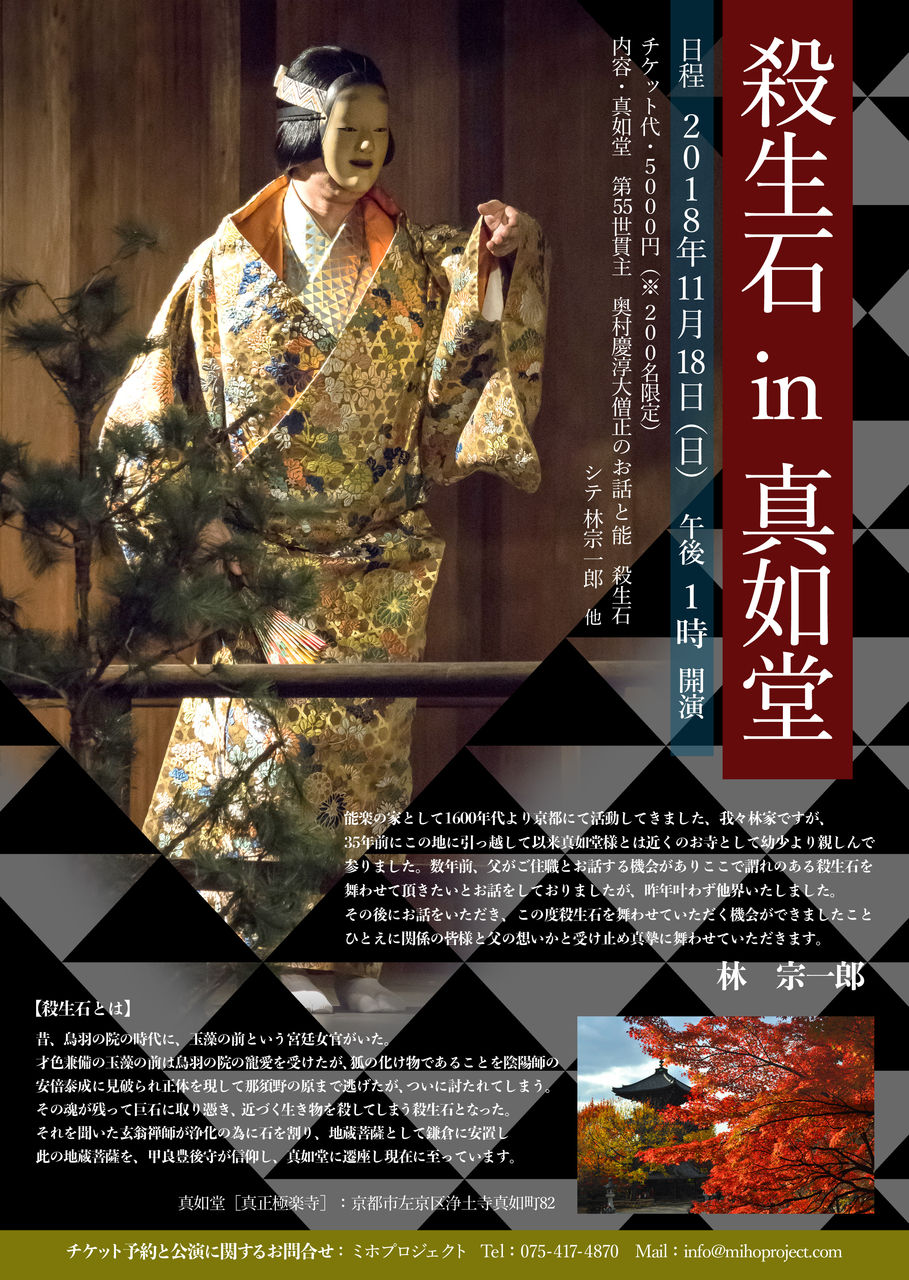 能楽師 林宗一郎公式ホームページ http://hayashi-soichiro.jp/ [ご予約] ①予約人数 ②代表者氏名 ③電話番号を明記の上、下記までご連絡下さい。