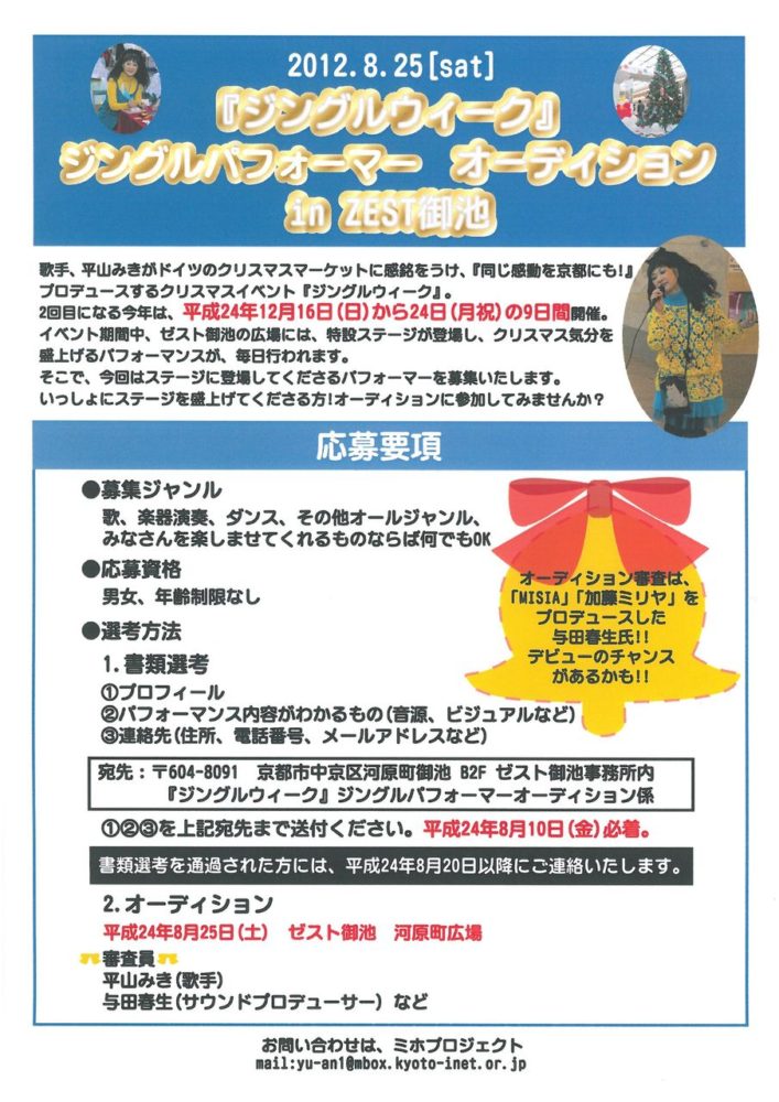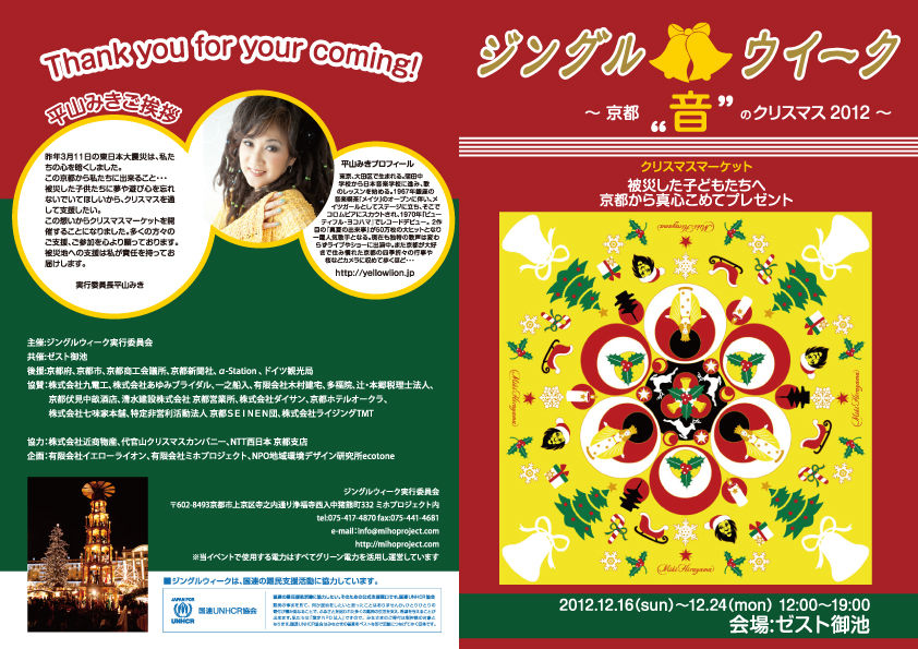本格的な冬の寒さ到来ですが、皆様如何お過ごしでしょうか。 いよいよ明日、12月16日(日)より京都・ゼスト御池にて「ジングルウィークー京都“音のクリスマス”2012ー」を開催致します! フードコーナーあり、クリスマスグッ..