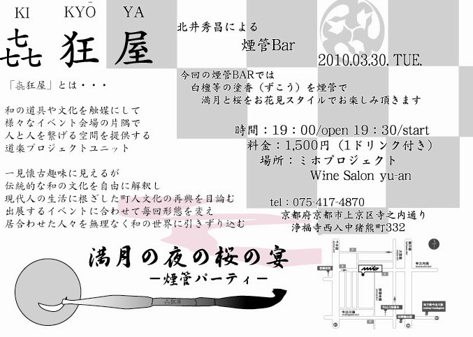 2010.3.30.満月の夜の桜の宴‐煙管パーティ 満月と、桜と、煙管 満月の下、桜を愛でながら楽しい宴を開きます。 昨年大変ご好評頂きました煙管BAR、第2弾となります今回は白檀等の塗香(ずこう)を煙管で、 満月と桜を..
