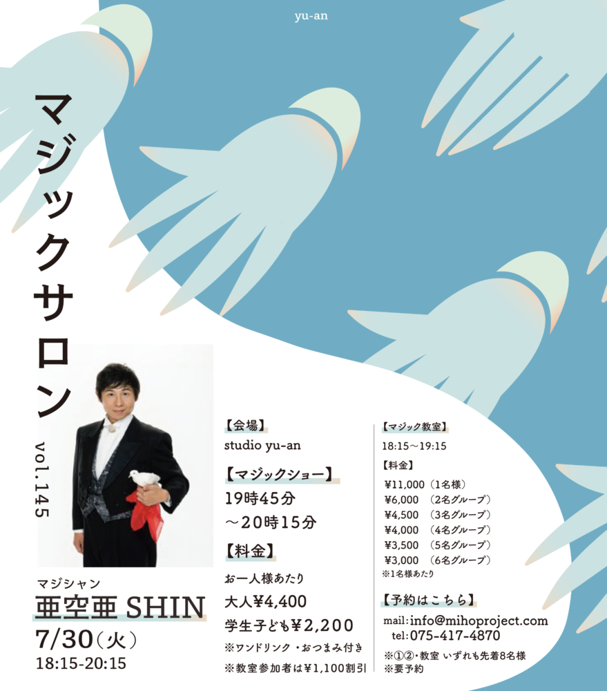 プロのマジシャンのマジックを、間近で体験できるサロン。ワインや軽食もご用意しております。マジック教室はもちろん、ショーだけのご参加も歓迎しております。 <日程> 2024年 7月 30日(火) <時間> マジック教室 1..